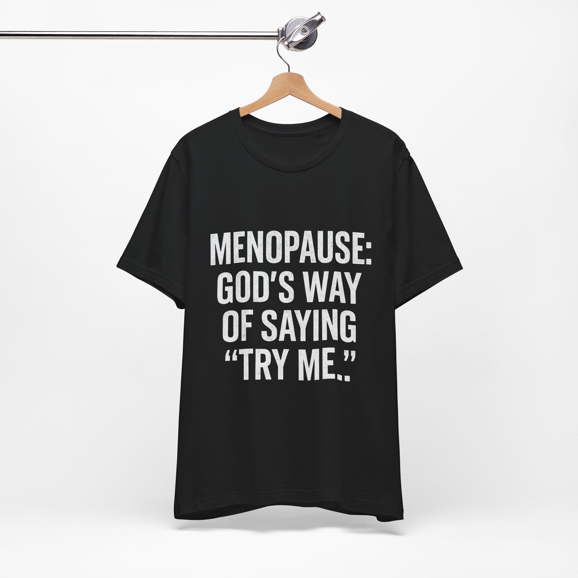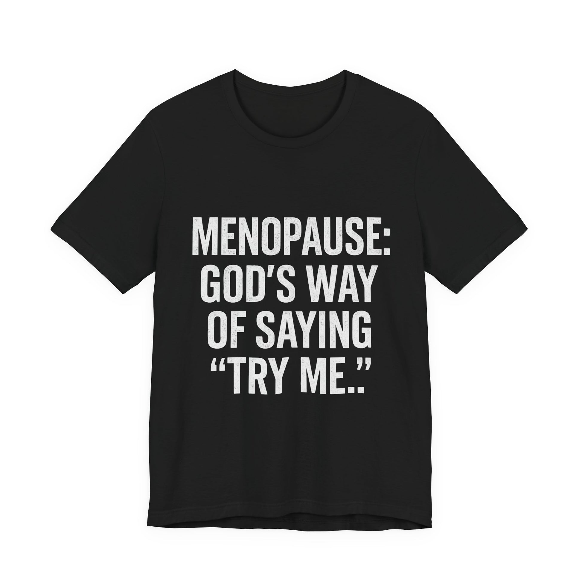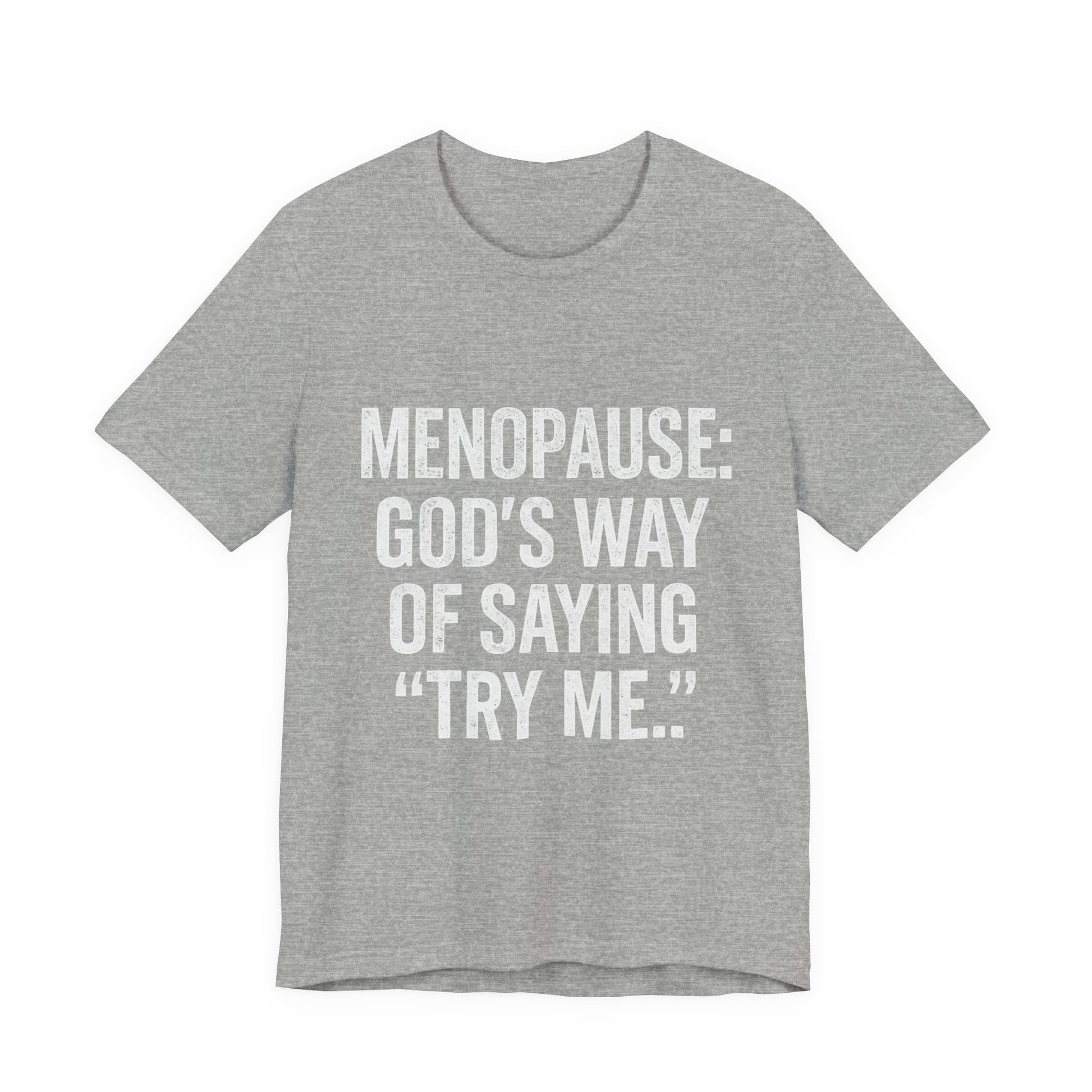 Menopause Tee — “Menopause: God’s Way of Saying ‘Try Me’” Short Sleeve Shirt